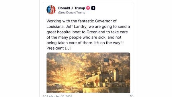 وكتب ترامب في منشور له: “بالتعاون مع حاكم ولاية لويزيانا الرائع، جيف لاندري، سنرسل سفينة طبية رائعة إلى جرينلاند لرعاية العديد من المرضى الذين لا يتلقون الرعاية هناك. إنها في طريقها!”