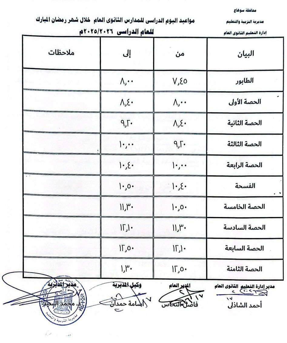 الأحد، 22 فبراير 2026 08:00 صأعلنت مديرية التربية والتعليم بمحافظة سوهاج، تعديل مواعيد اليوم الدراسي لمدارس التعليم الثانوي العام على مستوى المحافظة، وذلك خلال شهر رمضان المبارك للعام الدراسي 2025/2026، في إطار التيسير على الطلاب والمعلمين ومراعاة طبيعة الشهر الكريم.