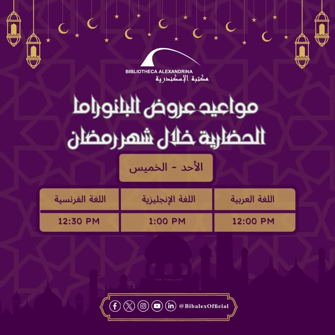 كما أعلنت مكتبة الإسكندرية عن تغيير مواعيد الجولات الإرشادية وعروض البانوراما الحضارية خلال شهر رمضان المبارك.
