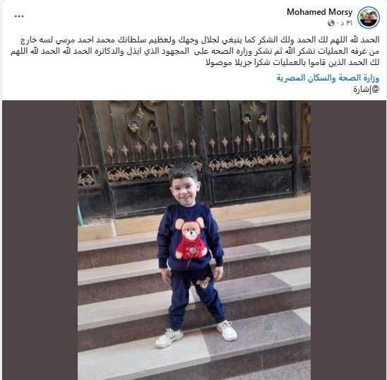 عم الطفل يوجه الشكر للفريق الجراحيوجاء بمنشور عم الطفل على موقع التواصل الاجتماعي، "الحمد لله.. اللهم لك الحمد ولك الشكر كما ينبغي لجلال وجهك ولعظيم سلطانك.. محمد أحمد مرسي لسه خارج من غرفة العمليات.. نشكر الله ثم نشكر وزارة الصحة على المجهود الذي بذل والدكاترة.. الحمد لله الحمد لله اللهم لك الحمد للذين قاموا بالعمليات شكرا جزيلا موصولا".