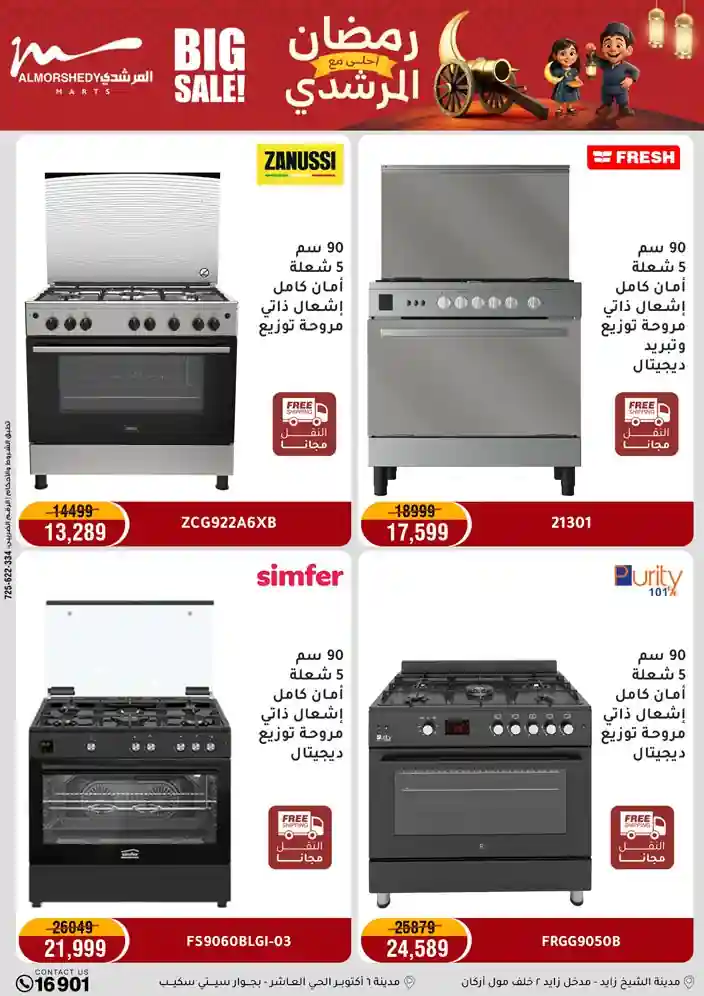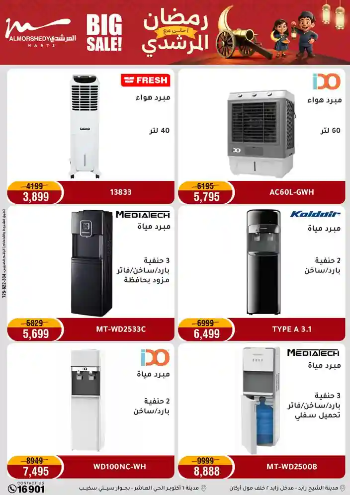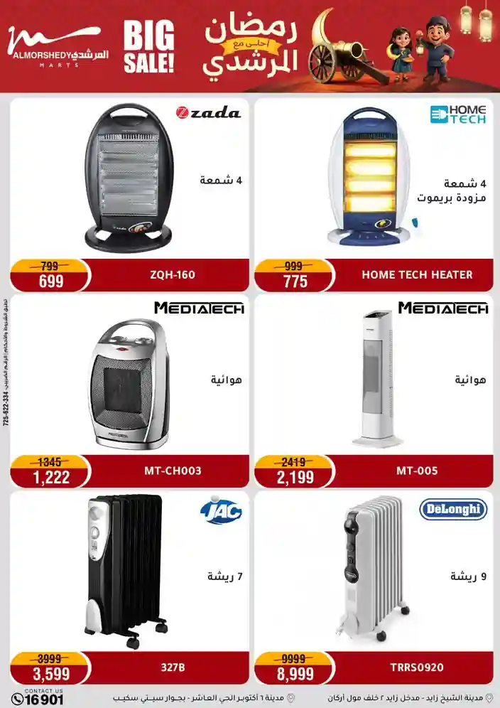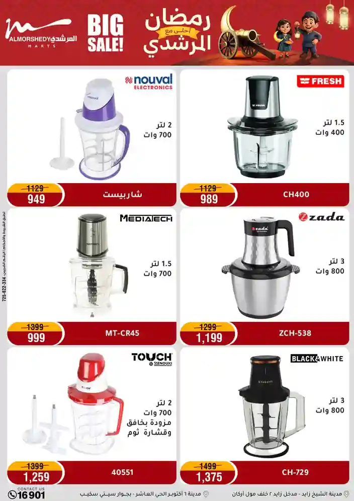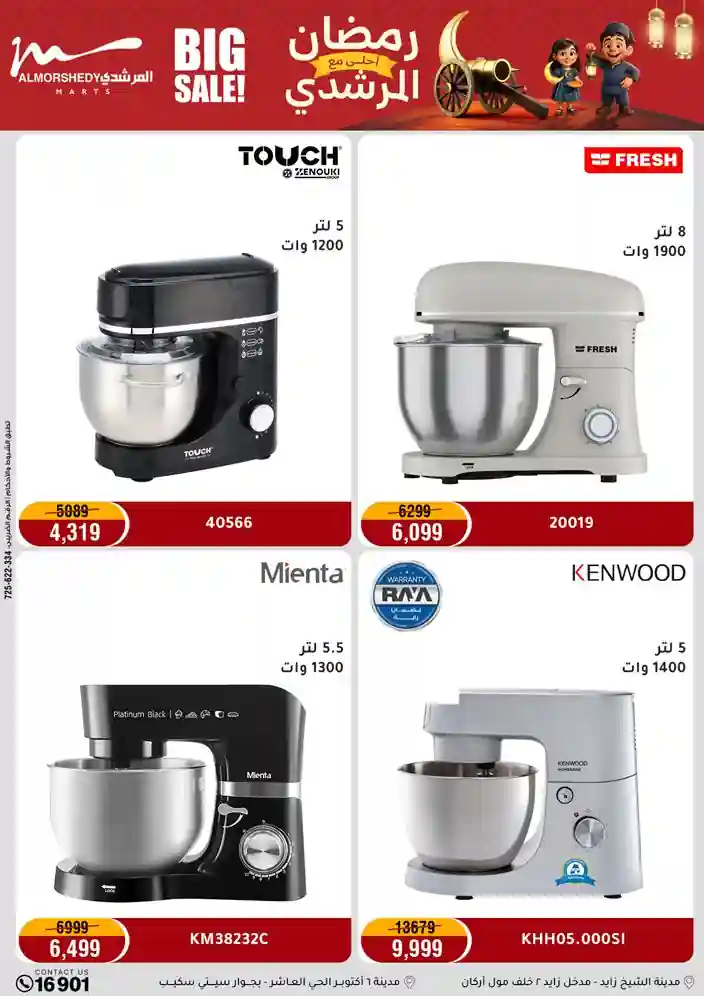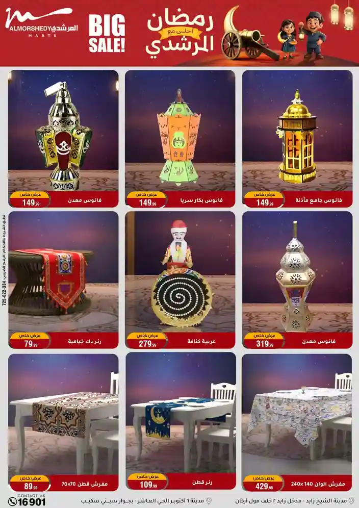 عروض جديدة من أسواق المرشدي مع اكبر مهرجان للتخفيضات في مصر خصومات حتى 70% وقسط براحتك بدون فوائد بأسعار العروض المخفضة على 12 شهر لحاملي بطاقة ائتمان CIB أو قسط براحتك مع VALU بدون مقدم حتى 60 شهر أو بدون مقدم وبدون فوائد مع نظام هاتريك وكمان النقل مجاني للقاهرة والجيزة والقليوبية على قسم الأجهزة الكهربائية والموبيليا والمراتب ( تطبق شروط المكان ) خصومات على جميع الأقسام أدوات منزلية – اجهزة كهربائية – مفروشات – موبيليا – نجف – سجاد – مراتب – ملابس رجالي وحريمي وأطفالي ومستلزمات ولعب الأطفال وجاليري وأقسام تانية كتير استمتع بالتسوق في أسواق المرشدي مع أكتر من 12 قسم و أكثر من 10,000 منتج يعني كل اللي بتحلم بيه عند المرشدي هتلاقيه