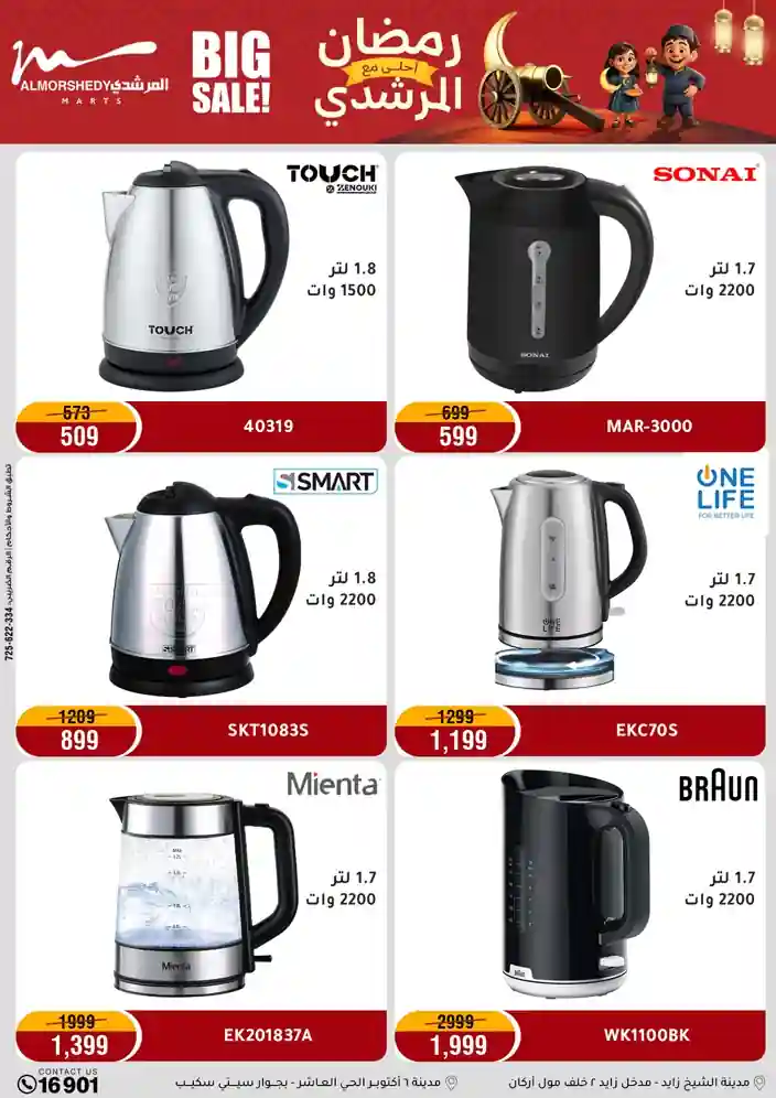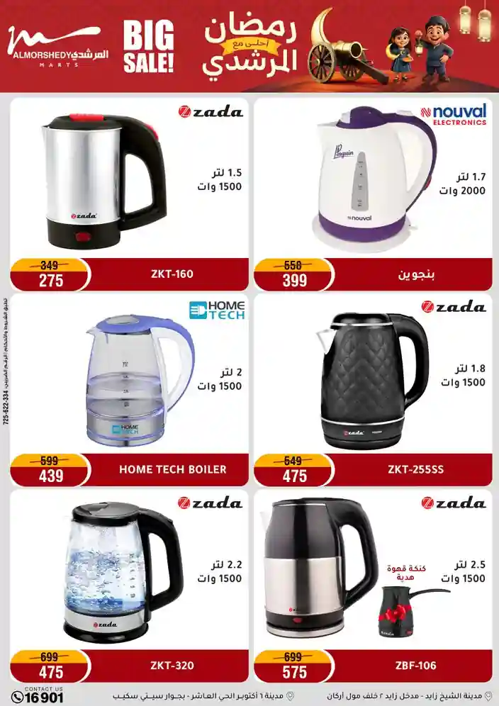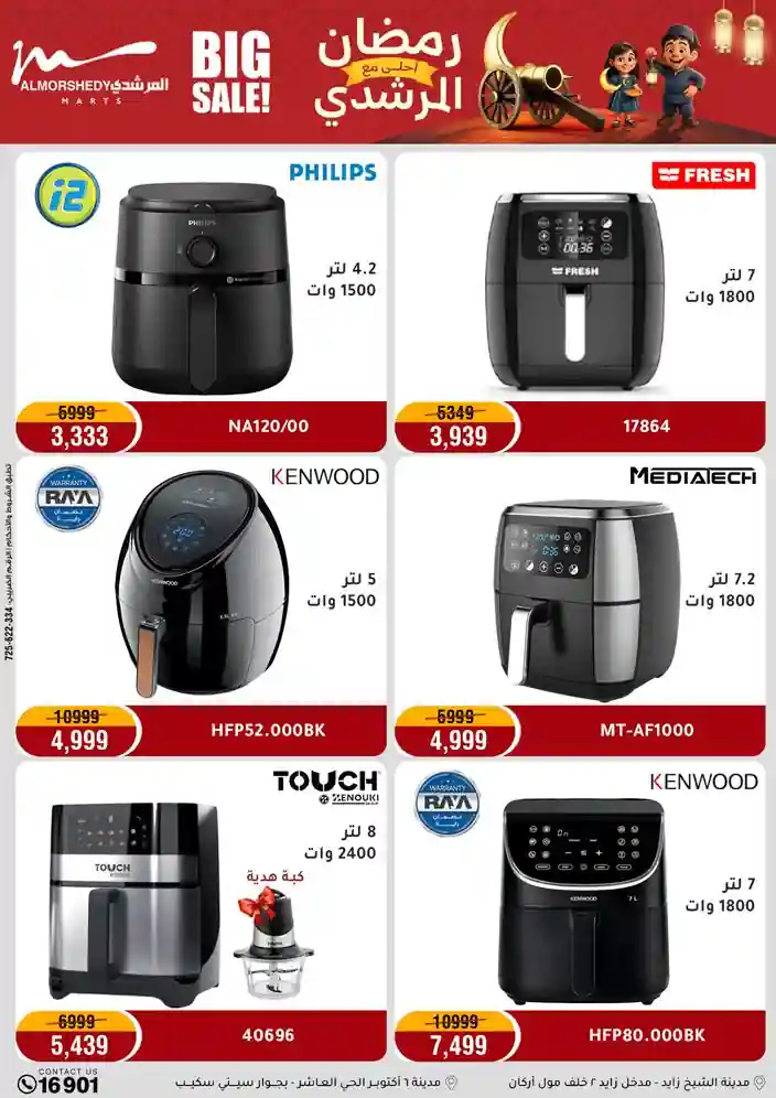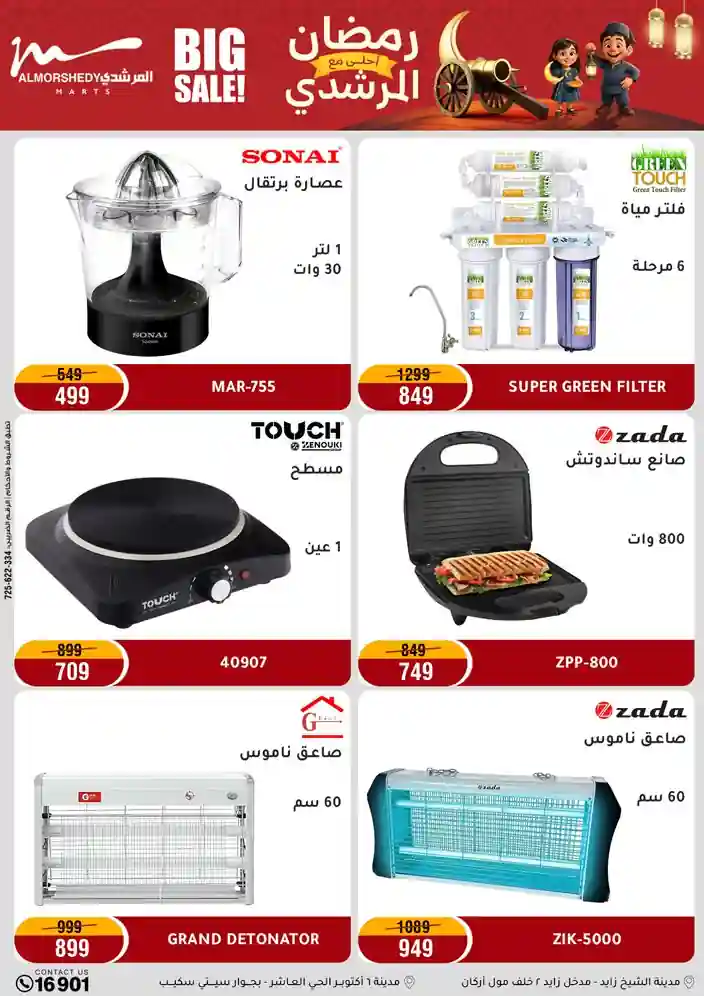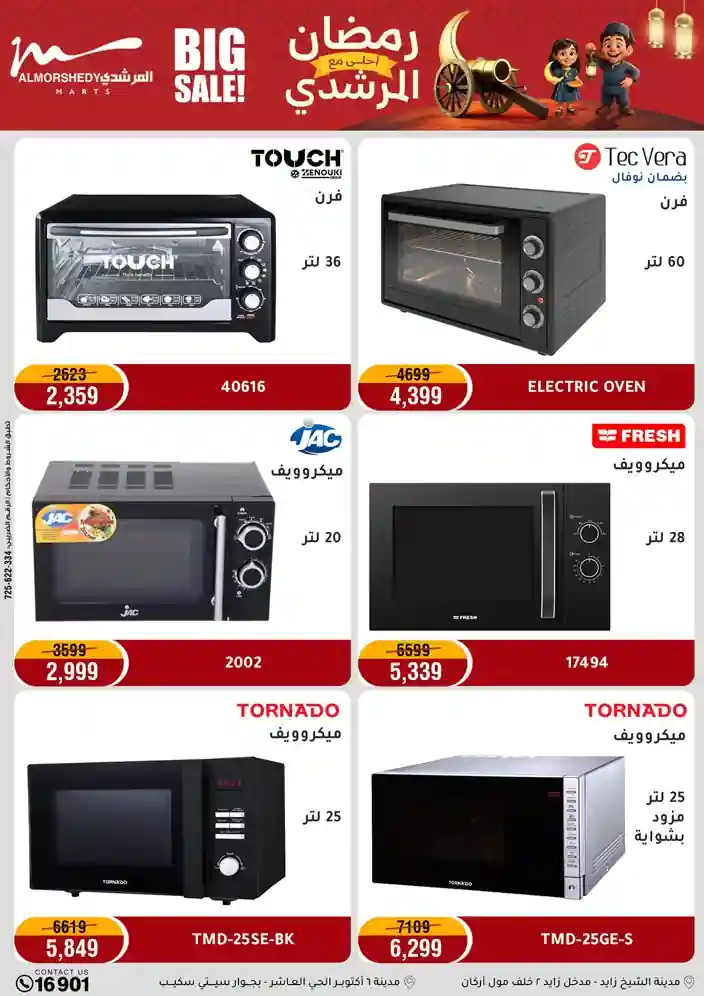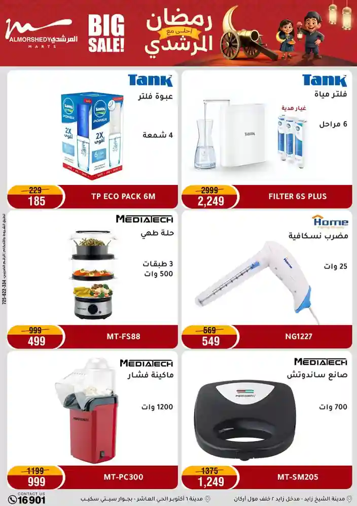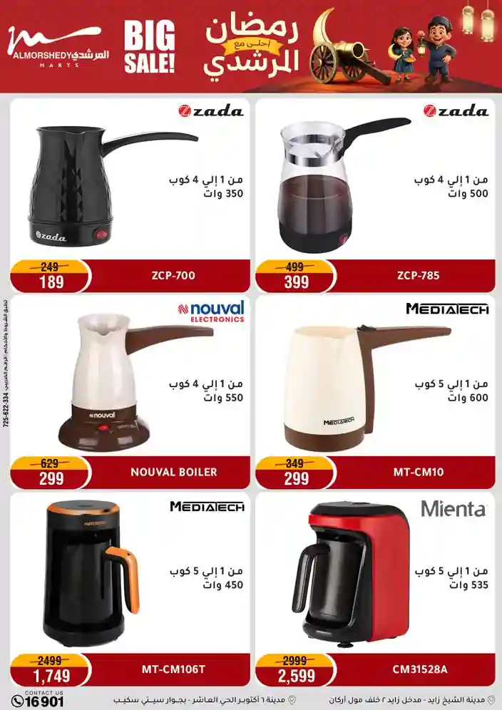 عروض جديدة من أسواق المرشدي مع اكبر مهرجان للتخفيضات في مصر خصومات حتى 70% وقسط براحتك بدون فوائد بأسعار العروض المخفضة على 12 شهر لحاملي بطاقة ائتمان CIB أو قسط براحتك مع VALU بدون مقدم حتى 60 شهر أو بدون مقدم وبدون فوائد مع نظام هاتريك وكمان النقل مجاني للقاهرة والجيزة والقليوبية على قسم الأجهزة الكهربائية والموبيليا والمراتب ( تطبق شروط المكان ) خصومات على جميع الأقسام أدوات منزلية – اجهزة كهربائية – مفروشات – موبيليا – نجف – سجاد – مراتب – ملابس رجالي وحريمي وأطفالي ومستلزمات ولعب الأطفال وجاليري وأقسام تانية كتير استمتع بالتسوق في أسواق المرشدي مع أكتر من 12 قسم و أكثر من 10,000 منتج يعني كل اللي بتحلم بيه عند المرشدي هتلاقيه