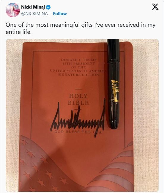 الإثنين، 23 فبراير 2026 03:41 معرضت المغنية الأمريكية نيكي ميناج، الحائزة على جائزة جرامي، أحدث إضافة إلى مجموعتها الخاصة من الهدايا على وسائل التواصل الاجتماعي، حيث تلقت نسخة من الإنجيل تحمل توقيع الرئيس الأمريكي دونالد ترامب، وهي النسخة الممهورة بشعار "God Bless The USA".