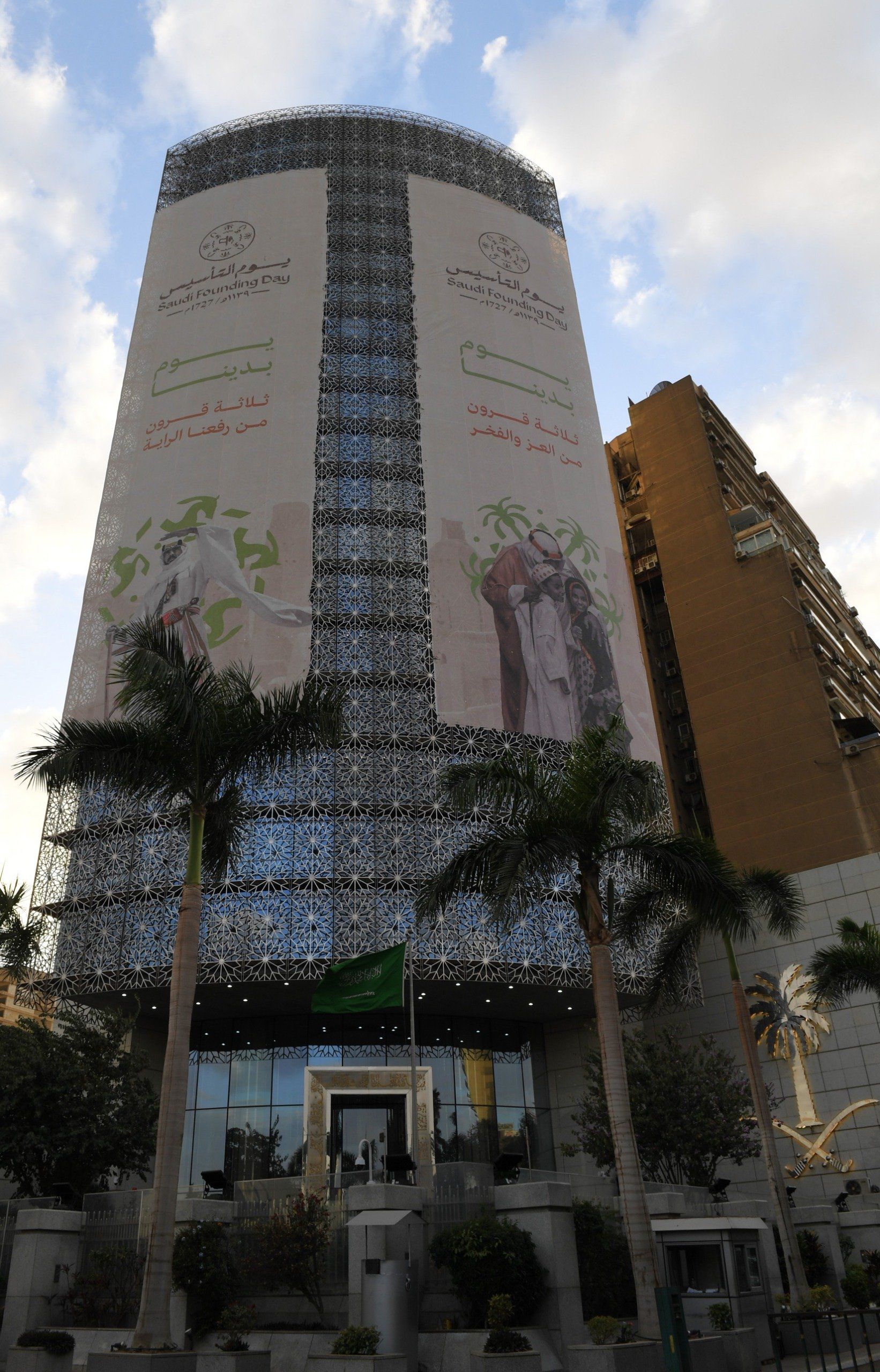 واكتست واجهة المبنى المطلة على النيل بلافتات عملاقة صُممت بلمسات فنية راقية، تحمل عبارات الاعتزاز "يوم بدينا" و"ثلاثة قرون من رفعنا الراية" ، مدعومة بصور تراثية تعكس الهوية السعودية الأصيلة. وفق السفارة السعويدةوقد تمازجت هذه اللوحات الاحتفالية الضخمة مع رموز الدولة وتفاصيلها التاريخية في تناغم بصري بديع، حيث بدت الواجهة كلوحة أنيقة نابضة بالحياة تستحضر مسيرة البناء من الدرعية عام 1727م على يد الإمام محمد بن سعود وهي اللحظة التي أرست دعائم دولةٍ راسخة الأركان، امتد أثرها ليصوغ حاضر المملكة الزاهر ويؤسس لمستقبلها الطموح.