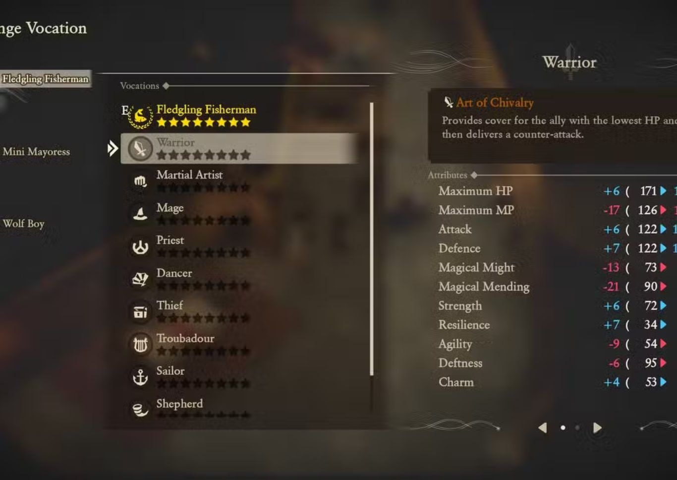 | Warrior | وظيفة قتالية أمامية تركز على الهجوم والدفاع الجسدي | Art of Chivalry تحمي الحليف الأضعف مع هجوم مضاد | وظيفة أساسية باستخدام Vocation Orb |