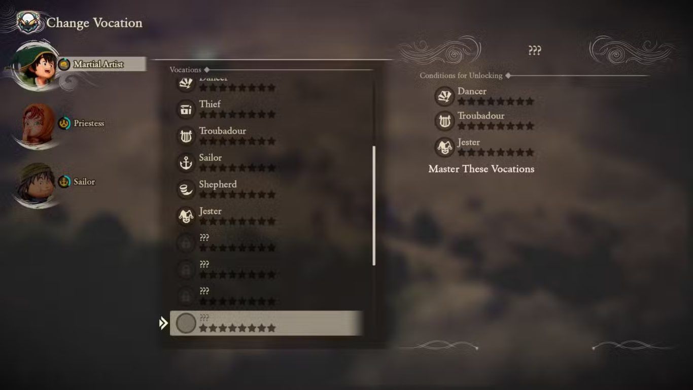 | Troubador | وظيفة دعم قتالية تقلل استهلاك MP وتعزز الفريق | Encore يلغي استهلاك MP مؤقتا | وظيفة أساسية باستخدام Vocation Orb |