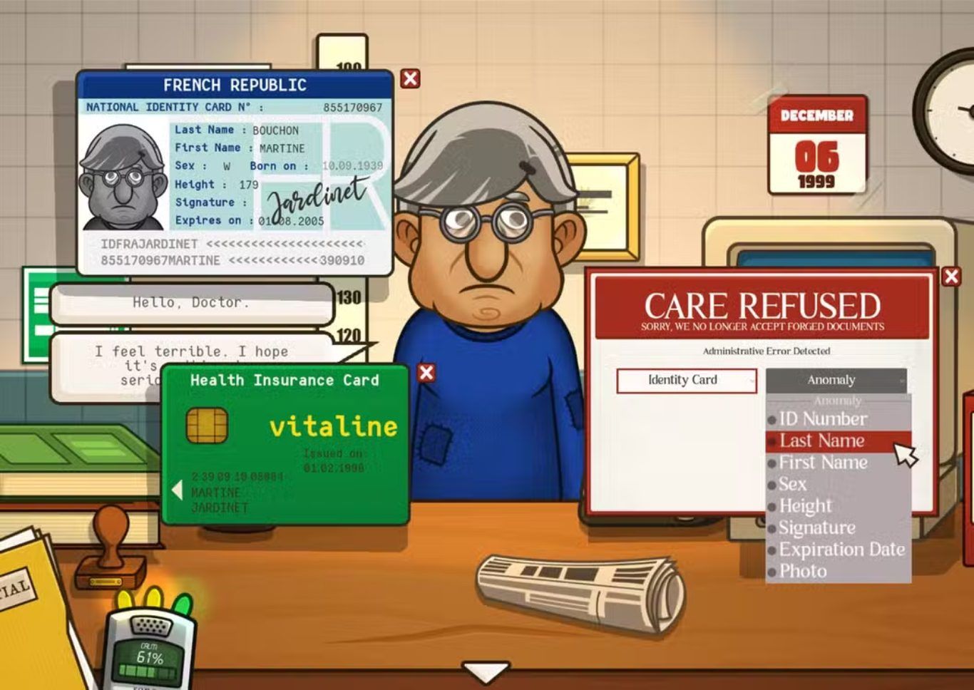 يتقدم المرضى المحتملون إلى المكتب واحدا تلو الآخر ويقومون بتقديم مجموعة من الوثائق التي يتعين على اللاعب فحصها بعناية لتحديد أهليتهم للحصول على الرعاية الصحية حيث يصبح التدقيق في التفاصيل الصغيرة أمرا حاسما.
