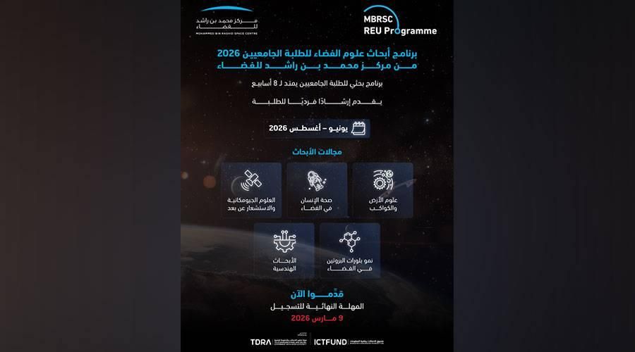 أعلن مركز محمد بن راشد للفضاء فتح باب التسجيل في برنامج أبحاث علوم الفضاء للطلبة الجامعيين 2026، في إطار جهوده المستمرة لتأهيل وتمكين جيل جديد من الكوادر الإماراتية في مجالات علوم الفضاء وتخصصات العلوم والتكنولوجيا والهندسة والرياضيات.