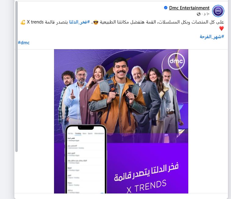 أعلنت قناة dmc عن تصدر مسلسل فخر الدلتا قائمة تريندات موقع x وذلك بعدما شهدت الحلقة السادسة من مسلسل "فخر الدلتا"، المعروض على قناة DMC ومنصة Watch it الرقمية، مشاركة فخر، الذي يجسد شخصيته الفنان أحمد رمزي، في أحد الإعلانات عن "السمنة الفلاحي"، قبل أن يكتشف أن الهدف من المشاركة هو السخرية منه.