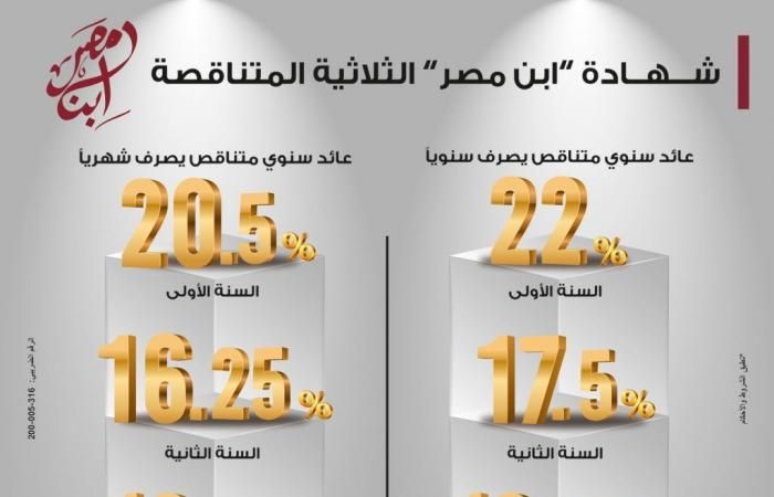 تعد شهادة الادخار الثلاثية المتناقصة «ابن مصر» لمدة 3 سنوات، من الأوعية الادخارية المتميزة والتي تتيح للعميل حرية الاختيار من دوريات صرف عائد متنوعة شهريًا وسنويًا، بالإضافة الى عوائد تنافسية متنوعة؛ حيث يبلغ العائد بدورية صرف سنويًا إلى %22.00 في السنة الأولى، و%17.50 في السنة الثانية، و%13.25 في السنة الثالثة. كما يصل العائد بدورية صرف شهريًا إلى %20.50 في السنة الأولى، و%16.25 في السنة الثانية، و%12.25 في السنة الثالثة.