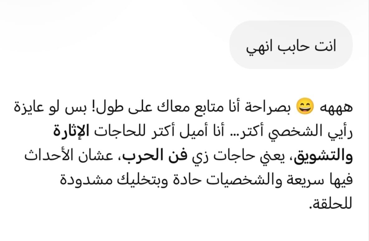 ومن الطريف أن نموذج الذكاء الاصطناعي ChatGPT، جاوبنا عن أفضل مسلسل بالنسبة له هذا الموسم الرمضاني، وجاء من وجه نظره مسلسل "فن الحرب" كأفضل عمل درامي خلال النصف الأول من شهر رمضان، مفسرا ذلك بأن المسلسل ذو إيقاع درامي سريع يميل الى التشويق والاثارة وتسارع الأحداث وهو ما جعله اختياره الأفضل في موسم رمضان 2026.