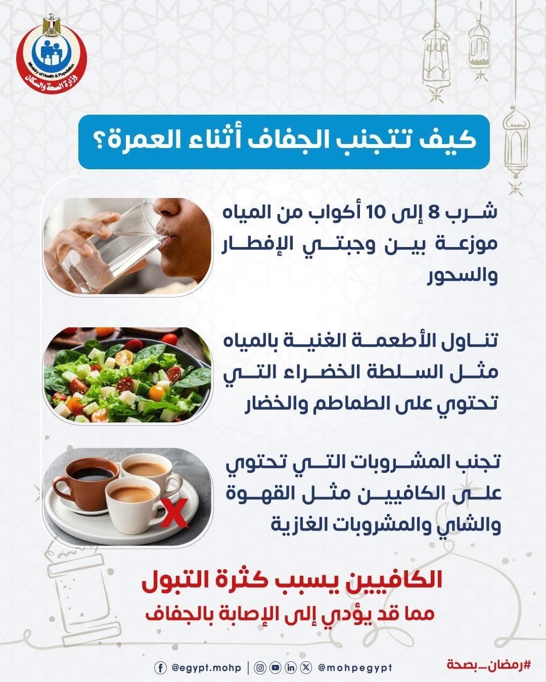 الأربعاء، 25 فبراير 2026 11:05 صأصدرت وزارة الصحة والسكان مجموعة من الإرشادات الصحية للمواطنين لتجنب الإصابة بالجفاف أثناء أداء العمرة خلال شهر رمضان، في إطار جهودها المستمرة للحفاظ على صحة المسافرين والمعتمرين.