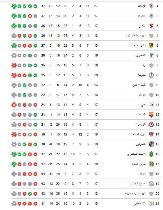 يحتل فريق الزمالك صدارة ترتيب الدوري برصيد 37 نقطة، متفوقا على بيراميدز صاحب الوصافة بفارق الأهداف، بينما يحتل الأهلى المركز الثالث برصيد 36 نقطة، متفوقا على سيراميكا صاحب نفس الرصيد بالأهداف أيضا.