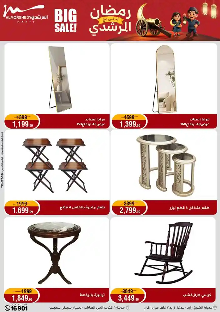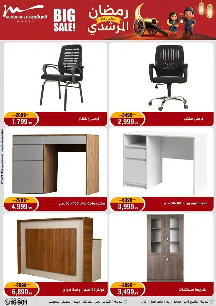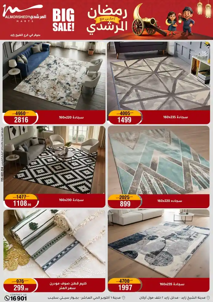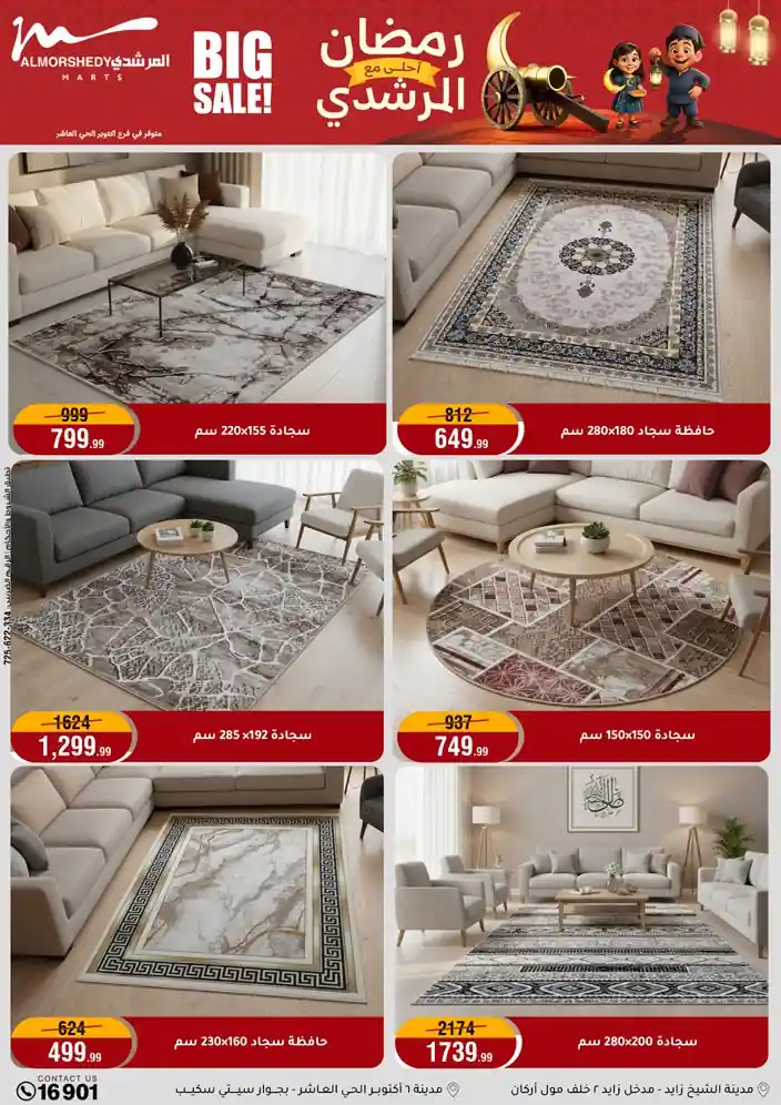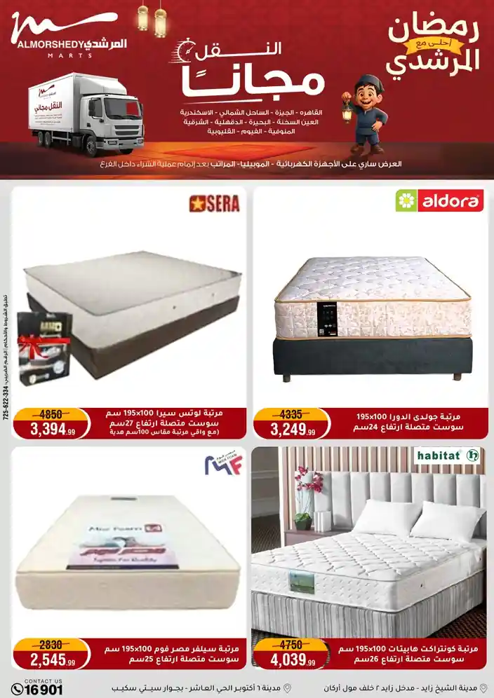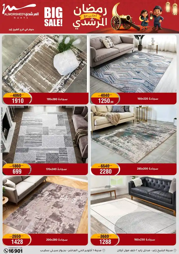 عروض جديدة من أسواق المرشدي مع اكبر مهرجان للتخفيضات في مصر خصومات حتى 70% وقسط براحتك بدون فوائد بأسعار العروض المخفضة على 12 شهر لحاملي بطاقة ائتمان CIB أو قسط براحتك مع VALU بدون مقدم حتى 60 شهر أو بدون مقدم وبدون فوائد مع نظام هاتريك وكمان النقل مجاني للقاهرة والجيزة والقليوبية على قسم الأجهزة الكهربائية والموبيليا والمراتب ( تطبق شروط المكان ) خصومات على جميع الأقسام أدوات منزلية – اجهزة كهربائية – مفروشات – موبيليا – نجف – سجاد – مراتب – ملابس رجالي وحريمي وأطفالي ومستلزمات ولعب الأطفال وجاليري وأقسام تانية كتير استمتع بالتسوق في أسواق المرشدي مع أكتر من 12 قسم و أكثر من 10,000 منتج يعني كل اللي بتحلم بيه عند المرشدي هتلاقيه
