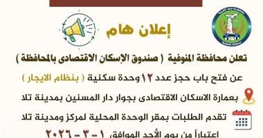 الأربعاء، 25 فبراير 2026 01:28 مأعلن صندوق الإسكان الاقتصادي بمحافظة المنوفية عن فتح باب الحجز لـ12 وحدة سكنية "بنظام الإيجار" بعمارة الإسكان الاقتصادي بجوار دار المسنين بمدينة تلا، وذلك اعتباراً من يوم الأحد الموافق 1 مارس القادم وحتى 15 مارس 2026، علي ان يتم تقديم الطلبات بمقر الوحدة المحلية لمركز ومدينة تــلا، في إطار توجيهات اللواء عمرو الغريب محافظ المنوفية بتحسين جودة الخدمات المقدمة للمواطنين.