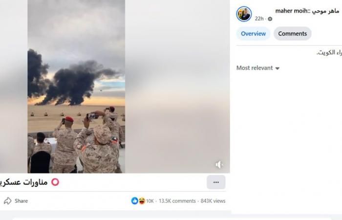 وصاحب المقطع وصف مُضلل يقول: "أدى الجيش الكويتي صباح اليوم واحدة من أخطر المناورات العسكرية في العالم، حيث تم إحراق إطارات قديمة قرب الحدود العراقية وتصاعدت أعمدة الدخان آلاف المترات ما أثار موجة كبيرة من الخوف والذعر بين العراقيين تسببت بموجة نزوح هائلة إلى دول الجوار".