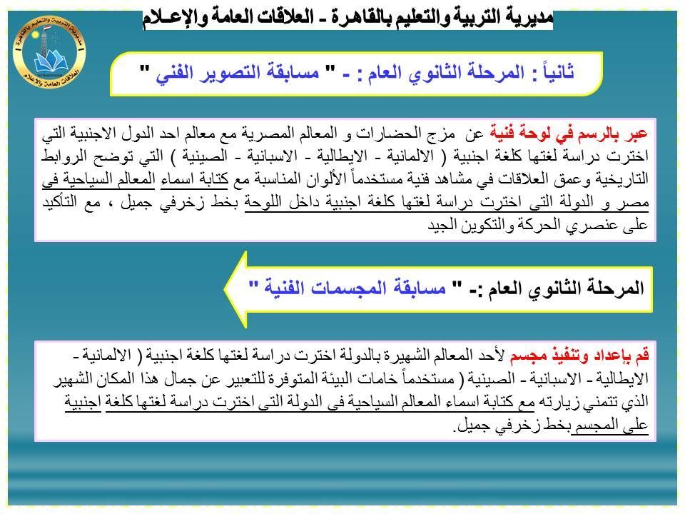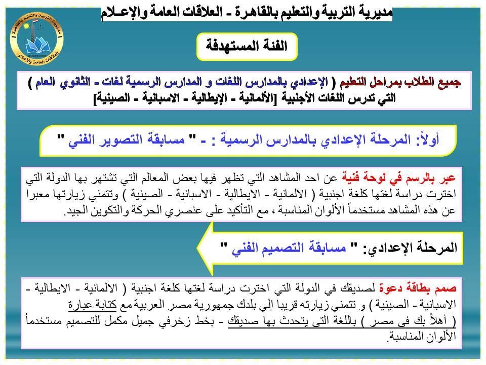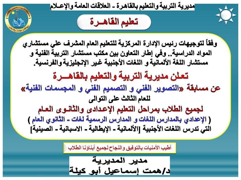 أعلنت مديرية التربية والتعليم بالقاهرة، عن انطلاق مسابقة «التصوير الفني – التصميم الفني – المجسمات الفنية» للعام الثالث على التوالي، لطلاب المرحلتين الإعدادية والثانوية العامة بالمدارس التي تدرس اللغات الأجنبية: