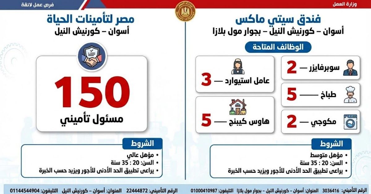 وأوضحت الوزارة أن النشرة تضم فرصًا متنوعة في عشرات التخصصات والمهن، برواتب مجزية تُحدد وفق طبيعة الوظيفة والمقابلة الشخصية، مع التزام كامل بتطبيق الحد الأدنى للأجور، والاستفادة من مظلة التأمينات الاجتماعية والصحية، بما يضمن بيئة عمل آمنة ومستقرة...كما تشمل النشرة فرصًا مخصصة لذوي الهمم، في إطار سياسة الدمج المجتمعي والتمكين الاقتصادي...وتغطي الفرص محافظات: القاهرة، الجيزة، القليوبية، الإسكندرية، الغربية، الإسماعيلية، المنيا، سوهاج، المنوفية، بورسعيد، الوادي الجديد، أسوان، السويس، الشرقية، في تخصصات متعددة تشمل:التسويق والموارد البشرية، الهندسة (اتصالات وكهرباء)، الميكانيكا والتحكم الكهربائي، الصيانة، المحاسبة، الإشراف الفني والموقعي، الإنتاج، المشتريات، المبيعات، الجودة، الأمن، المخازن، القيادة برخص مختلفة، الفندقة والمطاعم، إلى جانب أعمال الإنتاج والنظافة وتخصصات أخرى.