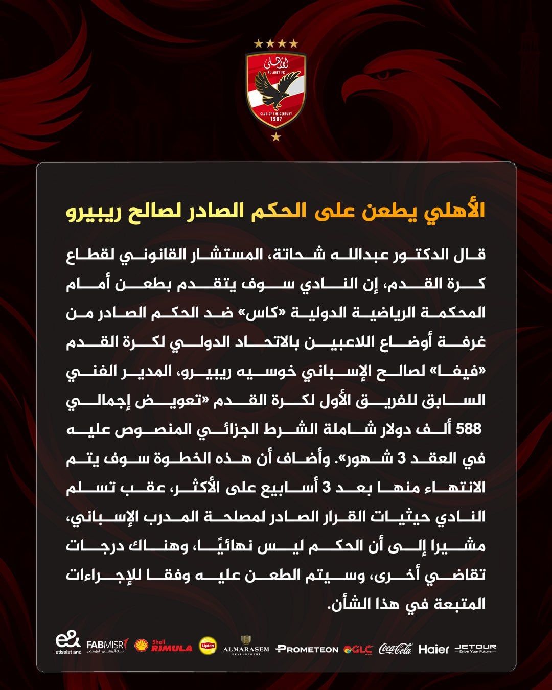 الخميس، 26 فبراير 2026 01:59 مقال الدكتور عبدالله شحاتة، المستشار القانوني لقطاع كرة القدم بالنادي الأهلي، إن النادي سوف يتقدم بطعن أمام المحكمة الرياضية الدولية «كاس» ضد الحكم الصادر من غرفة أوضاع اللاعبين بالاتحاد الدولي لكرة القدم «فيفا» لصالح الإسباني خوسيه ريبيرو، المدير الفني السابق للفريق الأول لكرة القدم «تعويض إجمالي 588 ألف دولار شاملة الشرط الجزائي المنصوص عليه في العقد 3 شهور».