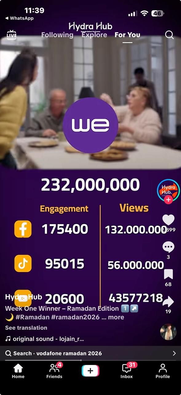 ويظهر هذا الأداء المتميز ريادة WE في قطاع الاتصالات والحلول الرقمية، وقدرتها على تقديم محتوى رمضاني يجذب الجمهور ويحقق أعلى مستويات التفاعل، كما تعكس الحملة التخطيط الدقيق والإبداع في تصميم محتوى مخصص لشهر رمضان، مع الاستمرار في تقديم محتوى مميز طوال الشهر لتعزيز تجربة المستخدمين الرقمية.