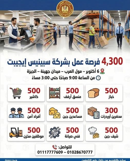 وزارة العمل : 4300 فرصة عمل في شركة سبينيس ايجيبت بالجيزة ورقم هاتف للتواصل