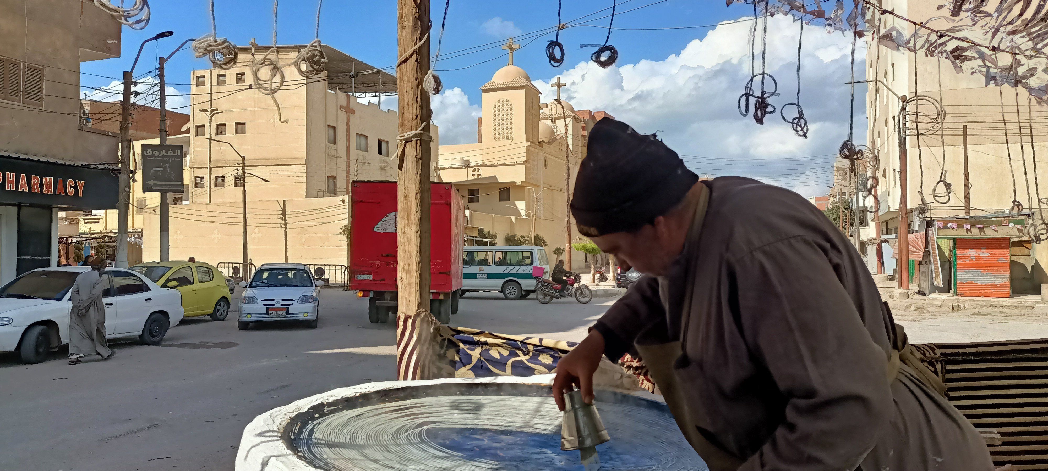 الجمعة، 27 فبراير 2026 04:00 صفي أحد شوارع حي الأزهرى بمدينة بنى سويف، وأمام كنيسة الأزهرى، يقف عم طارق يوميا خلال شهر رمضان، ممسكا بكوز الكنافة، يديره بخفة وخبرة اكتسبها عبر سنوات طويلة.