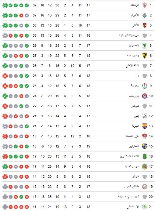 صدارة الدورى حصل فريق الزمالك عليها بعد تعثر سيراميكا أمام الإسماعيلى، فيما يحتل الأهلى المركز الثالث برصيد 36 نقطة، متفوقا على سيراميكا "الرابع" صاحب نفس الرصيد بالأهداف أيضا.