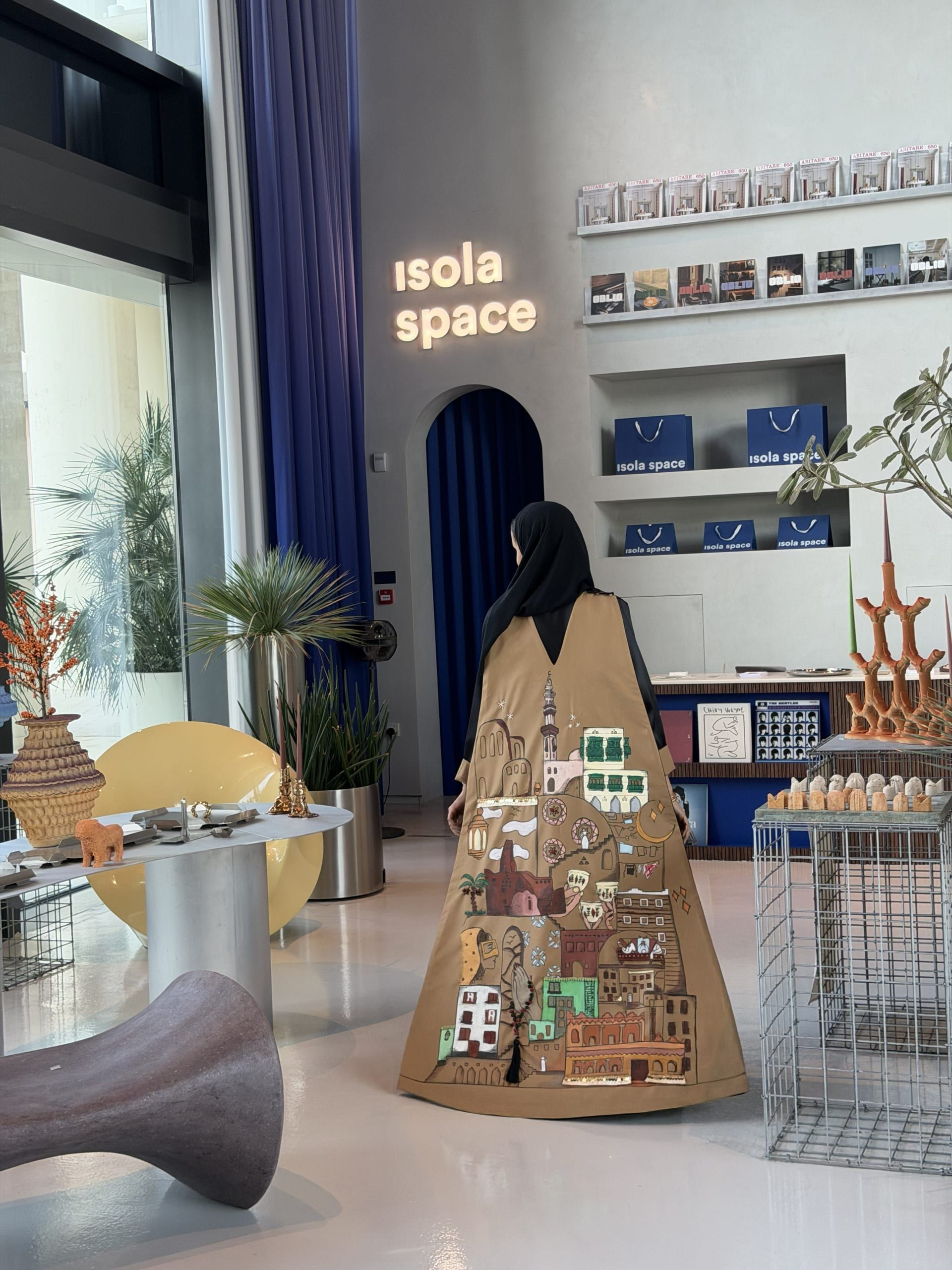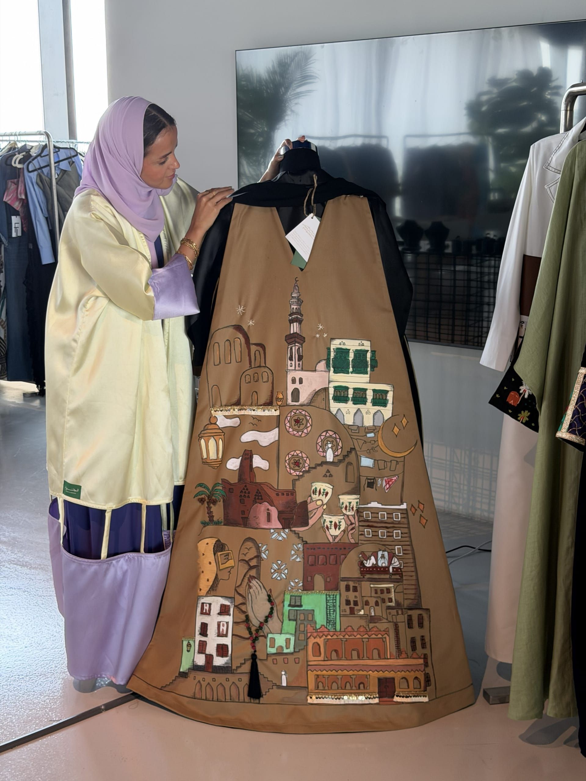وقالت: "استلهمنا الرسمة اليدوية على ظهر العباءة من ملامح العمارة التقليدية الممتدة من الطراز النجدي إلى الطابع الغربي والحجازي، مرورًا بالجنوب، وصولًا إلى تبوك والمنطقة الشرقية، لتتحول العباءة إلى لوحة فنية تجمع تنوع المشهد المعماري السعودي في تكوين متناغم واحد."