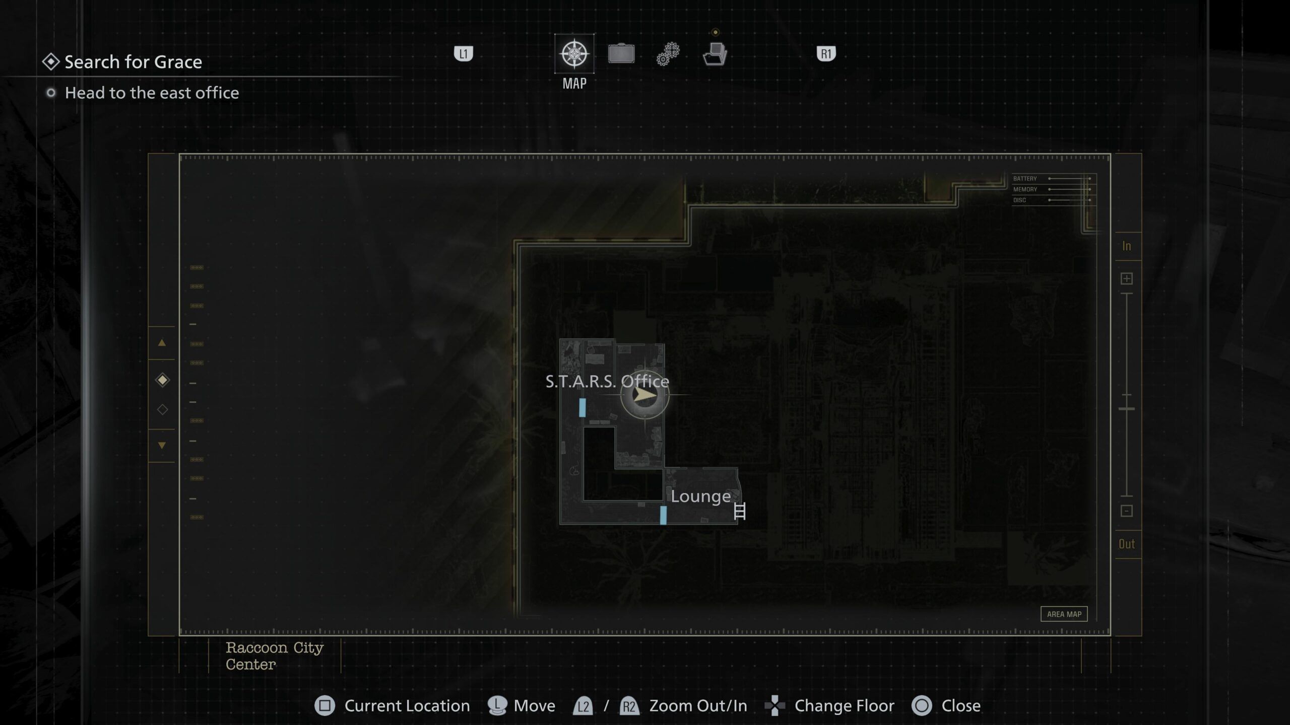 قبل مغادرة مكتب S.T.A.R.S.، افتح الخزانة بجانب الباب. ستجد هنا الدليل الثاني؛ صورة تُظهر زاوية التلفاز المعلق أيضًا في سقف غرفة العمليات.