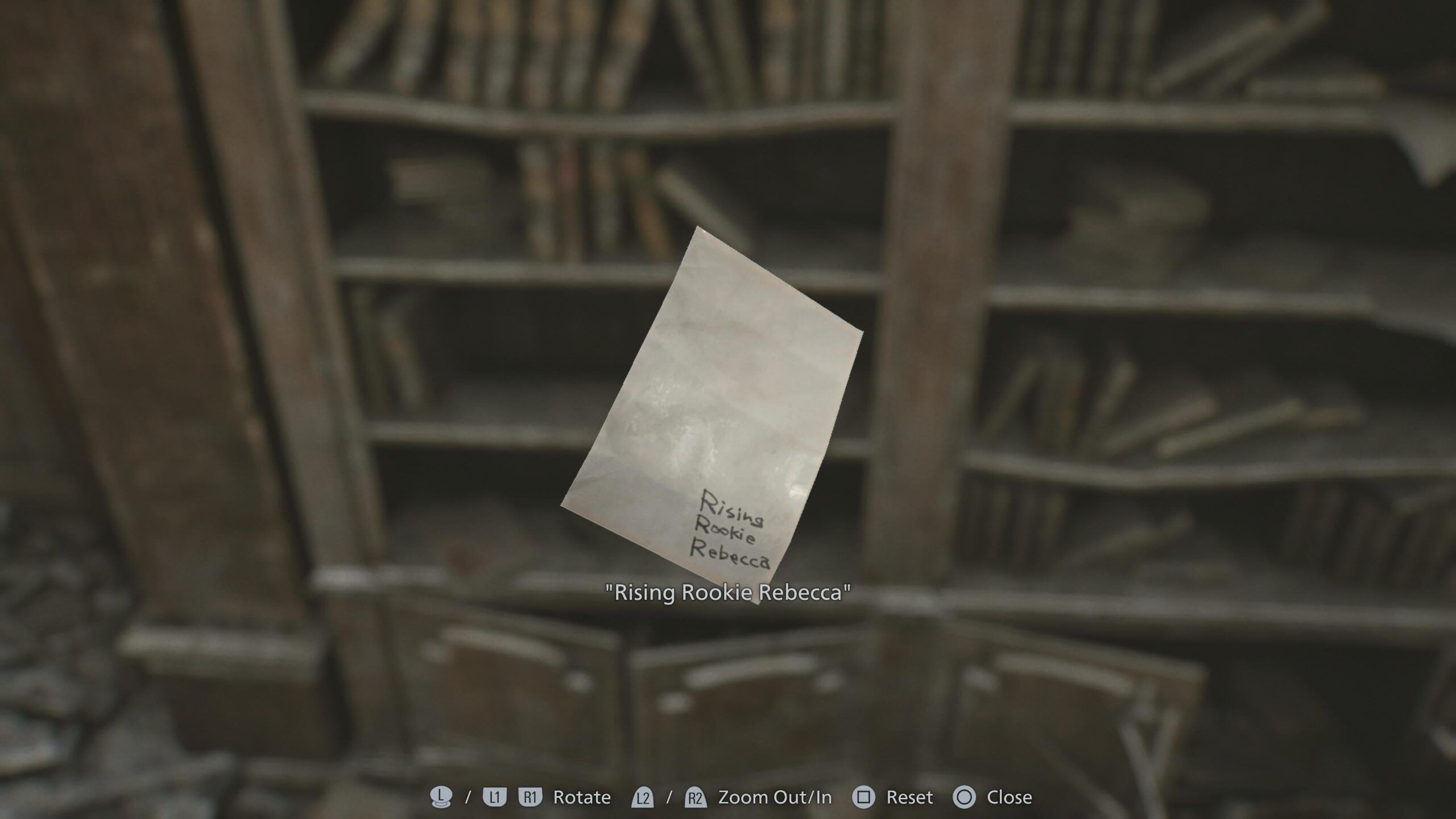 افتح الكتاب لتجد صورة ريبيكا تشامبرز، وعند قلب الصورة ستجد مكتوبًا على ظهرها Rising Rookie Rebecca. هذا الملاحظة تكشف رمز الحقيبة في R.P.D.: RRR.