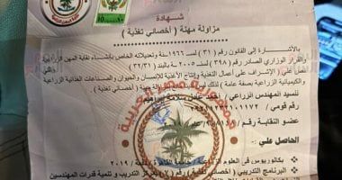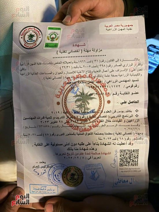 وتفيد الشهادة – الصادرة استنادًا إلى القانون رقم 31 لسنة 1966 بشأن إنشاء نقابة المهن الزراعية وتعديلاته، والقرار الوزاري رقم 398 لسنة 2005 – بأنه لا يوجد ما يمنع من مزاولته مهنة «أخصائي تغذية»، مع الإشارة إلى أن المهنة معتمدة بمصلحة الأحوال المدنية وفق المنشورين الدوريين رقمي 48 لسنة 2021 و68 لسنة 2023.