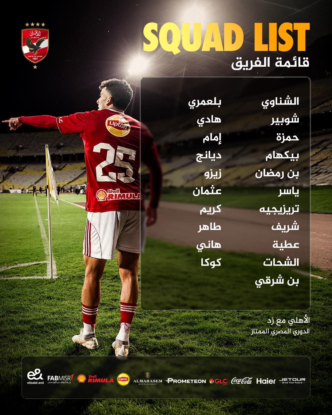 محمد الشناوي ومصطفى شوبير وحمزة علاء وأحمد رمضان بيكهام ومحمد علي بن رمضان وياسر إبراهيم ومحمود حسن تريزيجيه ومحمد شريف ومروان عطية وحسين الشحات وأشرف بن شرقي ويوسف بلعمري وهادي رياض وإمام عاشور وأليو ديانج وأحمد سيد زيزو ومروان عثمان وكريم فؤاد وطاهر محمد طاهر ومحمد هاني وأحمد نبيل كوكا.