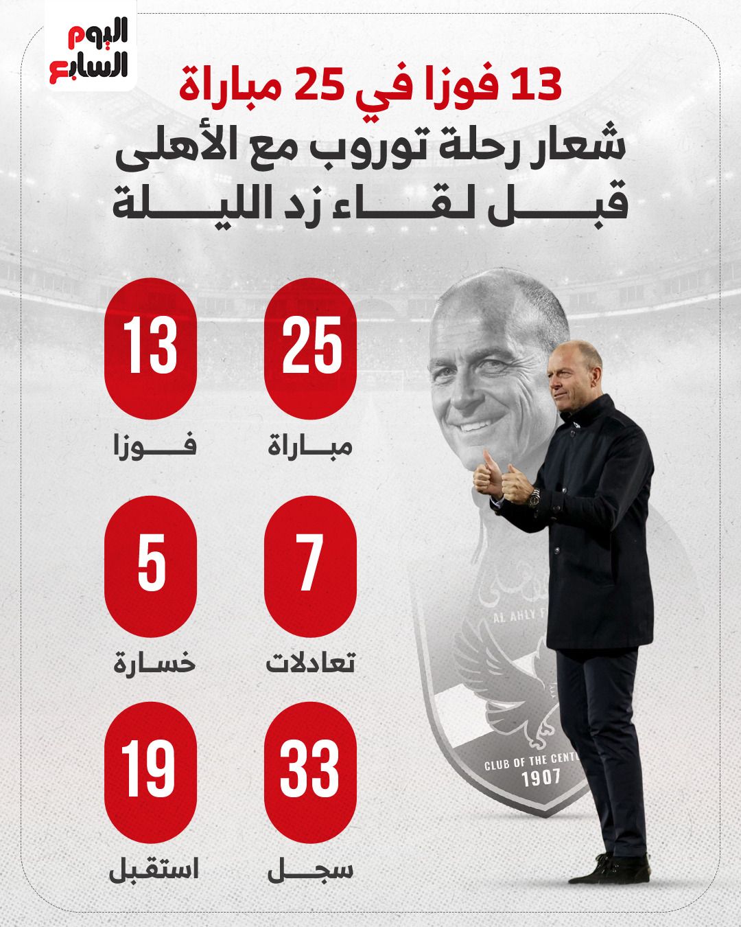 أرقام توروب مع الأهلىوتعد هذه المباراة رقم 26 للدنماركي ييس توروب المدير الفني للنادي الأهلي، منذ توليه القيادة الفنية للفريق، في أكتوبر من العام الماضي 2025، وخلال 25 مباراة سابقة، خاضها الفريق الأول لكرة القدم بالنادي الأهلي تحت قيادة توروب، نجح الأهلى فى تحقيق الفوز في 13 مباراة، وتلقى الهزيمة فى 5 لقاءات، وحضر التعادل فى 7 مباريات.