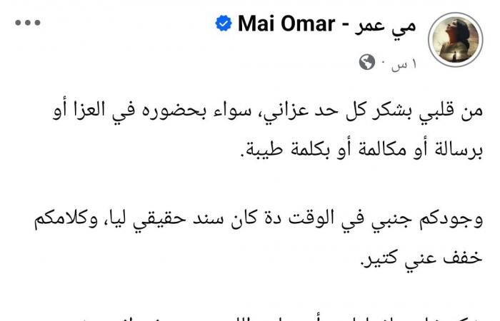 وكتبت مي عمر، عبر حسابها الشخصي بموقع التواصل الاجتماعي فيسبوك: “من قلبي بشكر كل حد عزاني، سواء بحضوره في العزا أو برسالة أو مكالمة أو بكلمة طيبة”.