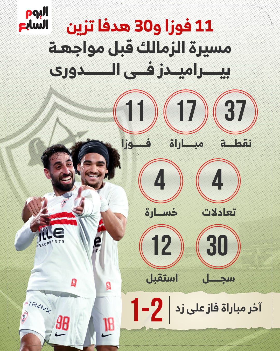 ويسعى الزمالك للحفاظ على قمة الدورى، حيث يحتل الصدارة، بعد التغلب على زد في المباراة الماضية، بنتيجة 2-1، ليصل رصيده الى النقطة 37 وهو نفس رصيد بيراميدز صاحب المركز الثانى، ونفس عدد مرات الفوز والتعادل والخسارة، حيث خاض كل من الزمالك وبيراميدز 17 مباراة، حققا الفوز في 11 مواجهة، والتعادل في 4، بينما الخسارة في مباراتين فقط.