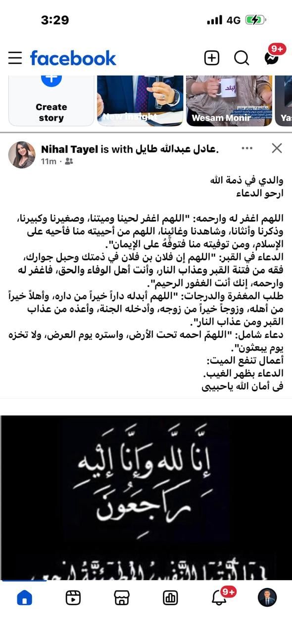 وتابعت نهال طايل، "اللهم اغفر له وارحمه، اللهم اغفر لحينا وميتنا، وصغيرنا وكبيرنا، وذكرنا وأنثانا، وشاهدنا وغائبنا، اللهم من أحييته منا فأحيه على الإسلام، ومن توفيته منا فتوفَّهُ على الإيمان".
