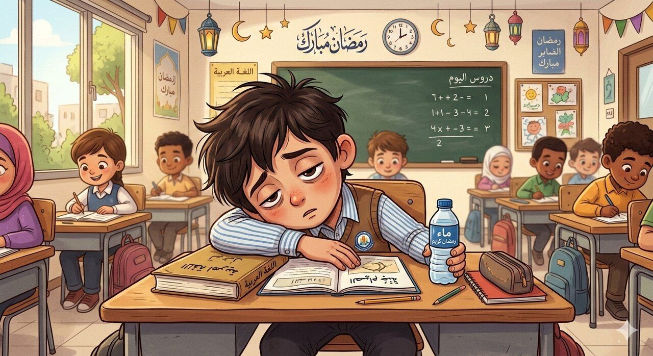 جاءت المعلمة هناء وجلست بجانبه. كانت تعرف أن بعض طلابها يجربون الصيام لأول مرة. قالت له بهدوء: