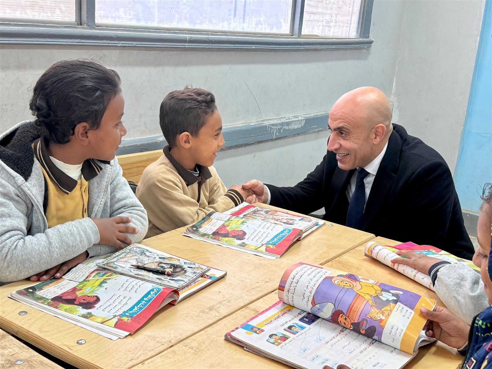 مصافحة طالب بالمرحلة الابتدائية.. رسالة دعم وتشجيع
