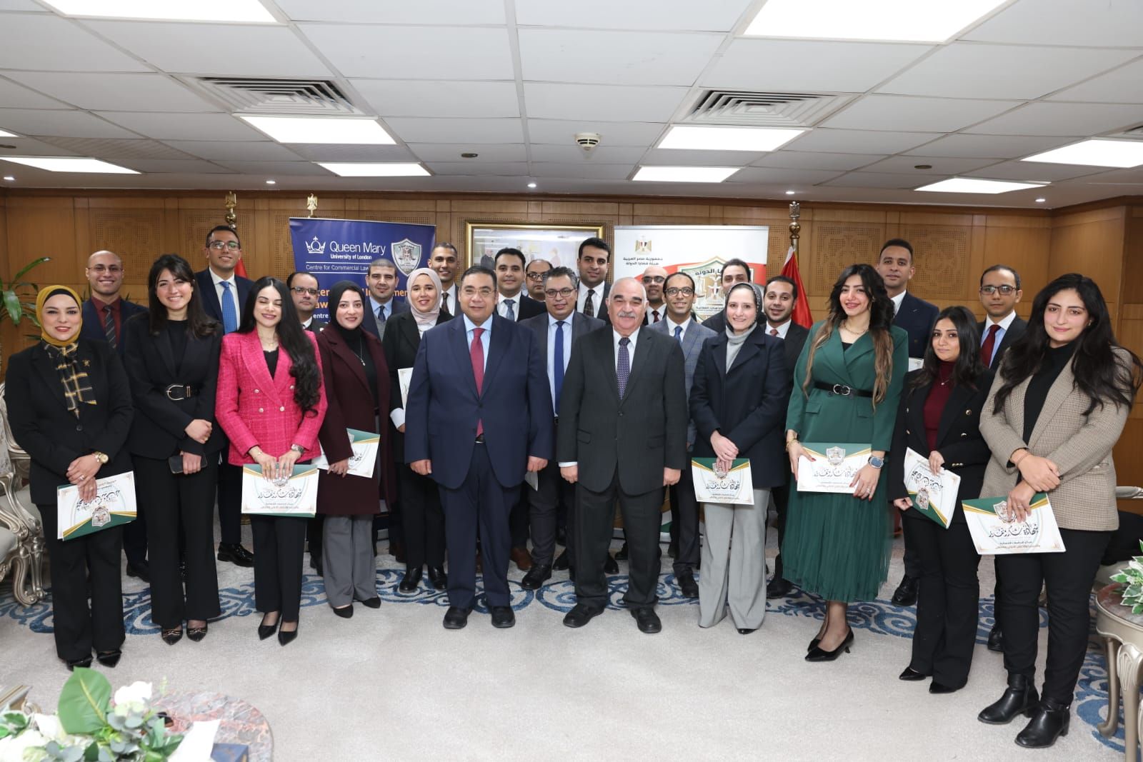 الإثنين، 02 مارس 2026 09:34 مأقيم ظهر اليوم بمقر مركز الدراسات القضائية والتدريب والتعاون الدولي والثقافي بهيئة قضايا الدولة بالمهندسين، حفل تسليم شهادات برنامج «القانون الدولي للاستثمار والتحكيم» (دفعتا 2024و2025)، والذي نُفِّذ بالتعاون مع مركز دراسات القانون التجاري بـQueen Mary University of London.