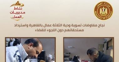 أعلنت مديرية عمل القاهرة عن نجاح مكاتب علاقات العمل بـ (مدينة نصر ومصر الجديدة) في إنهاء ثلاث منازعات عمالية ودياً، والحفاظ على حقوق العمال في أجواء من التوافق، تنفيذا لتوجيهات وزير العمل حسن رداد بتعزيز علاقات العمل وتفعيل آليات الحلول السلمية للنزاعات، وذلك بمتابعة السيد الشرقاوي مدير المديرية، و إسلام أحمد وكيل الوزارة، وتحت إشراف الإدارة المركزية للرعاية بالوزارة، وقد أسفرت المفاوضات عن النتائج التالية: