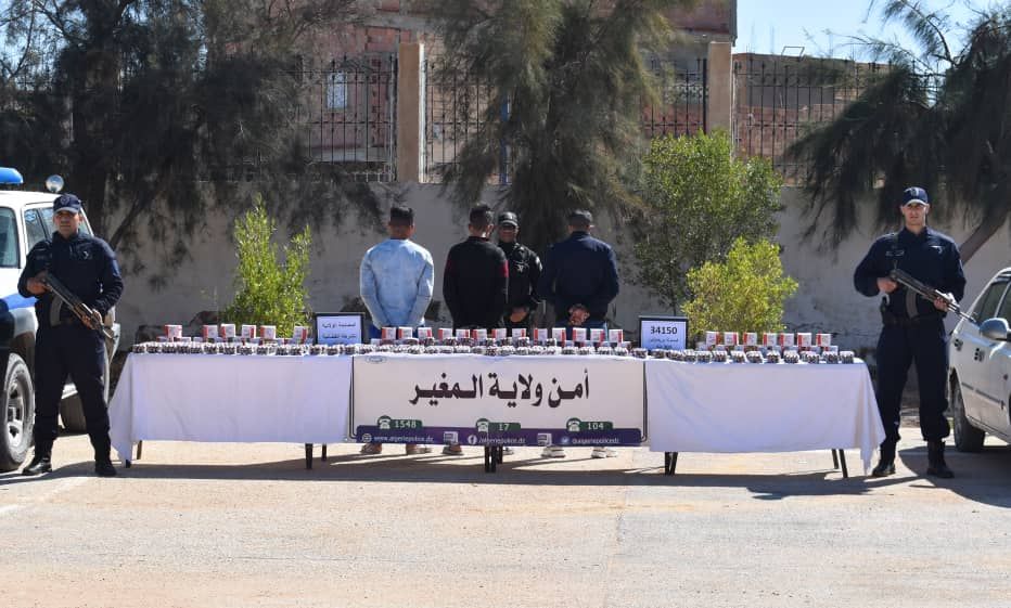 تمكنت شرطة المغير ممثلة في المصلحة الولائية للشرطة القضائية، من ضبط 34150 كبسولة من المؤثرات العقلية من نوع بريغابالين 300 ملغ. مع توقيف ثلاثة أشخاص و توقيف مركبة سياحية تستعمل في تهريب هذه السموم.