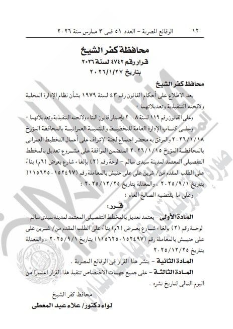 الثلاثاء، 03 مارس 2026 12:46 منشرت جريدة الوقائع المصرية، قرار محافظة كفر الشيخ رقم 4742 لسنة 2026، بشأن تعديل بالمخطط التفصيلي المعتمد لمدينة سيدي سالم وذلك في العدد 51 في 3 مارس 2026.