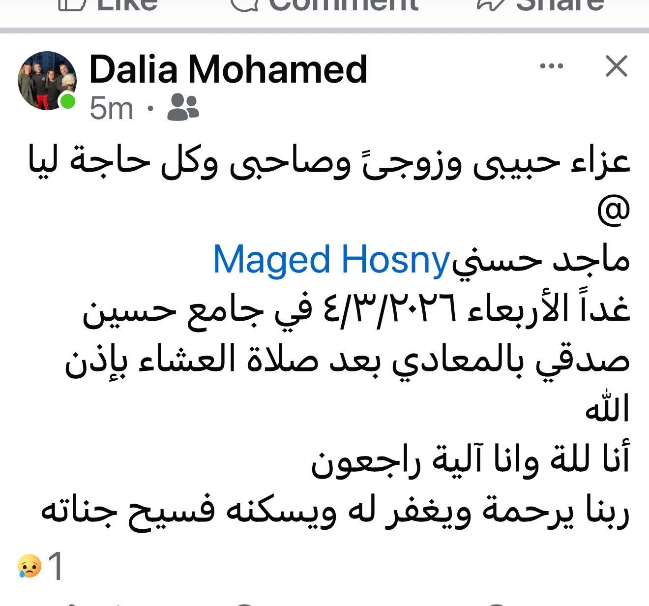 وكتبت داليا عبر حسابها على فيس بوك: عزاء حبيبى وزوجى وصاحبي وكل حاجة ليا ماجد حسني غدا الأربعاء في جامع حسين صدقي بالمعادي بعد صلاة العشاء بإذن الله، إنا لله وإنا إليه راجعون، ربنا يرحمه ويغفر له ويسكنه فسيح جناته.