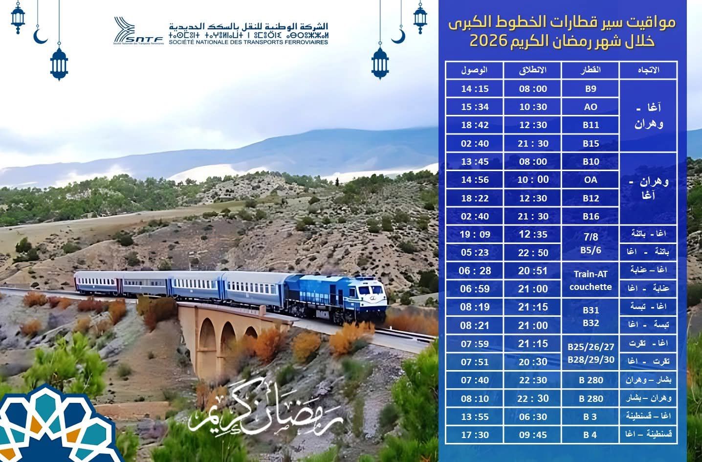أعلنت الشركة الوطنية للنقل بالسكك الحديدية عن برنامج خاص بمواقيت سير قطارات الخطوط الكبرى خلال شهر رمضان المبارك لعام 1447هـ الموافق لسنة 2026، في إطار تكييف خدمات النقل مع خصوصية الشهر الفضيل وتسهيل تنقل المواطنين عبر مختلف ولايات الوطن.