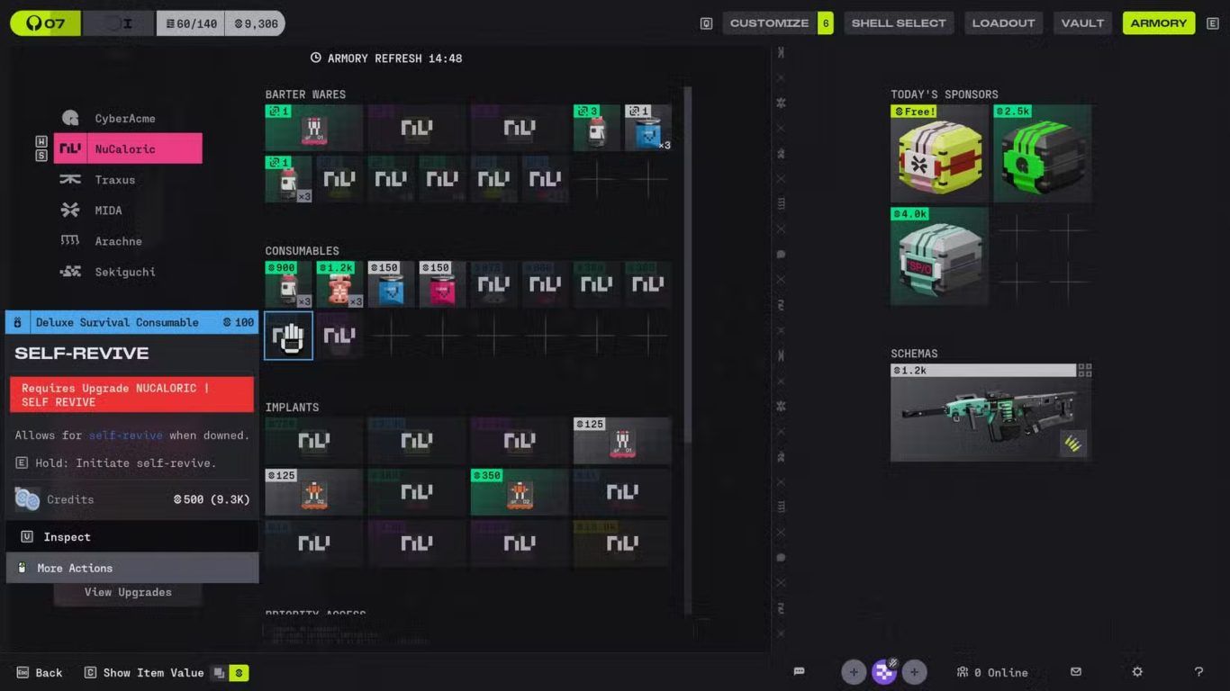 بمجرد الانتقال إلى تبويب NuCaloric سيكون بإمكان اللاعب شراء Self Revive مقابل 500 credits لكل وحدة. يتيح هذا السعر الثابت إمكانية التخطيط المسبق للميزانية قبل بدء المهمة خاصة لمن يفضلون خوض الغارات الفردية دون الاعتماد على دعم مباشر من فريق.