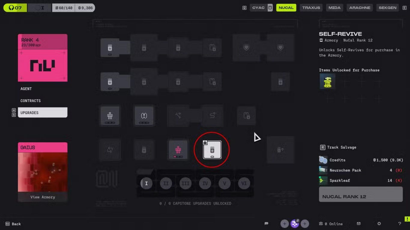 أما الطريقة الثانية فتتمثل في شراء Self Revive مباشرة من Armory بعد استيفاء شروط معينة داخل نظام التقدم. يتطلب ذلك أولًا إكمال Priority Contract الذي يحمل اسم Introducing NuCaloric من أجل فتح فصيل NuCal. بعد فتح الفصيل يجب تنفيذ عدة مهام لصالحه لرفع مستوى السمعة تدريجيًا حتى يصبح من الممكن فتح عنصر Self Revive ضمن شجرة المهارات الخاصة بـ NuCal.