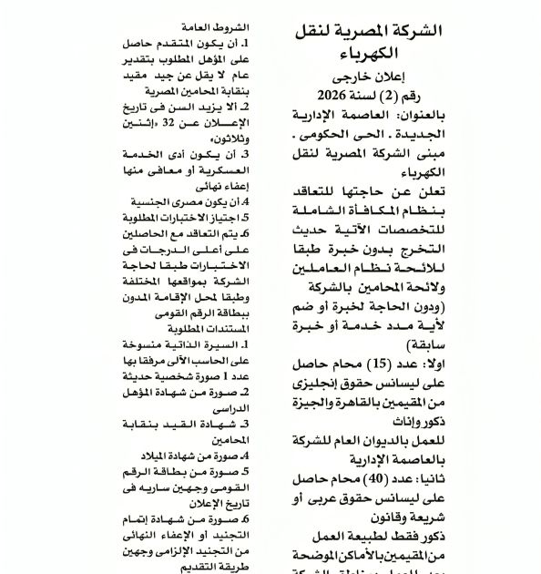 اعلان توظيف بتاريخ اليوم وظائف خالية بالشركة المصرية لنقل الكهرباء (إعلان خارجي رقم 2 لسنة 2026) عن حاجتها للتعاقد بنظام المكافأة الشاملة مع محامين حديثي التخرج للعمل بقطاعات الشركة المختلفة.