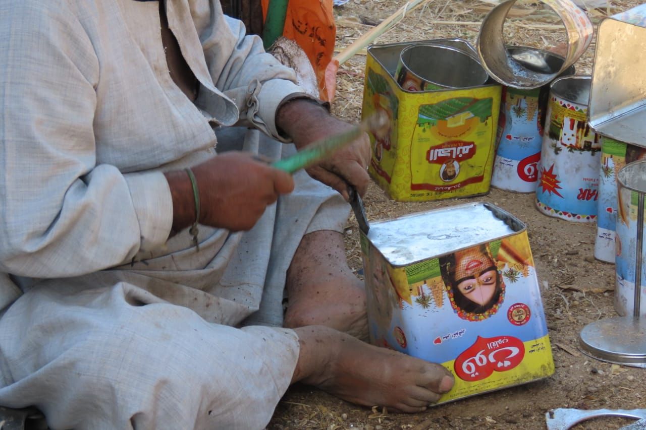 على جانب الطريق يفترش الرجل الأرض ليبدأ مهمته كل صباح، مهنة تعلمها منذ الصغر، فرافقته في الكبر لتصبح مصدر رزق له ولأسرته، الرجل تظهر على ملامح وجهه ابتسامة هادئة رغم مشقة العمل اليومي وكبر سنه، وهو يحول علب الصفيح إلى أدوات للمطبخ وصناعة المخبوزات، هنا حكاية كفاح يومي من عرق الجبين، وصناعة لم يعد يعمل بها إلا القليلون.