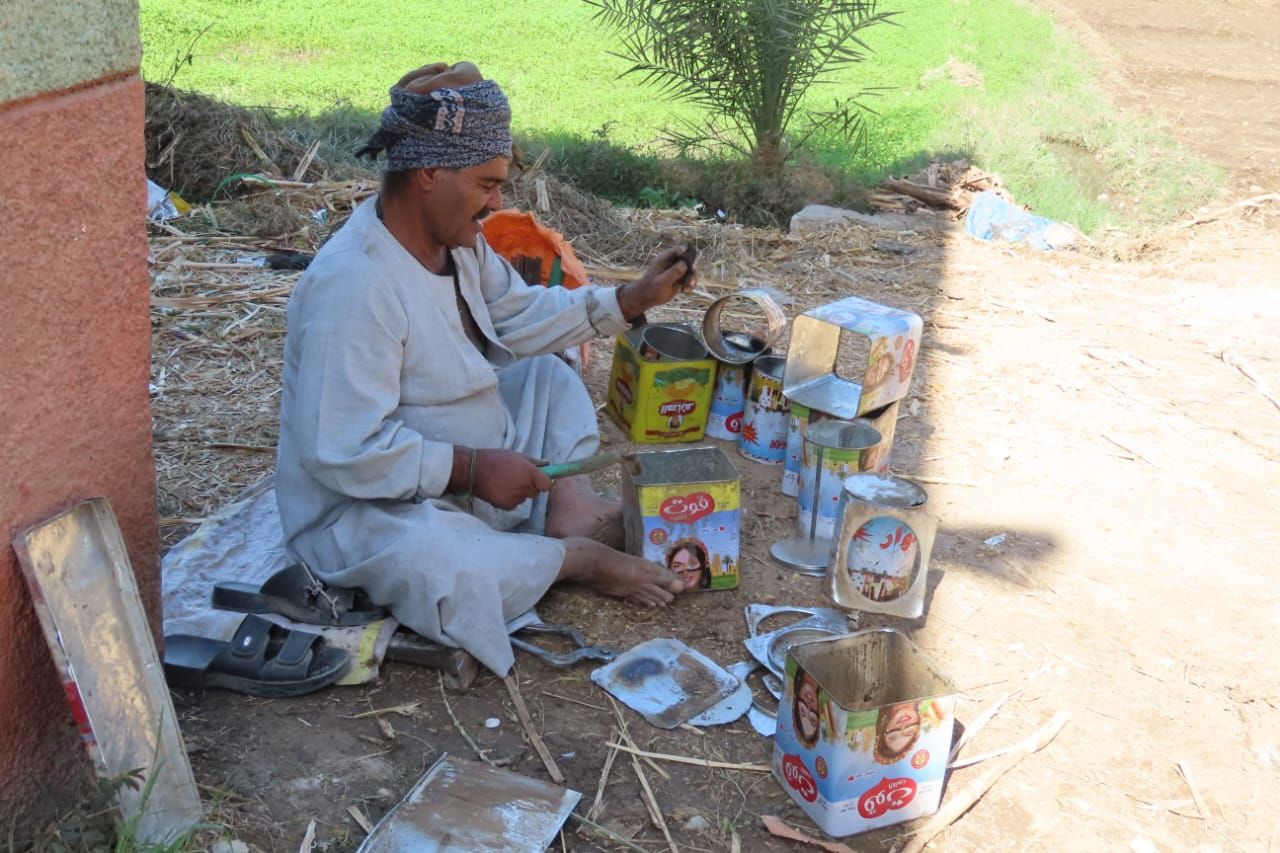 قال العم جمال محمود، إنه بدأ تلك الحرفة في عمر 10 سنوات وتعلمها من أحد صناعها في ذلك التوقيت، وعلى مدار تلك السنوات ظل يعمل بها مترجلا على قدميه بين المدن والقرى، من مركز إلى مركز داخل محافظة قنا، حتى وصل عمره إلى 66 عاما، حول خلالها الصفيح إلى أدوات للمطبخ والمنزل.