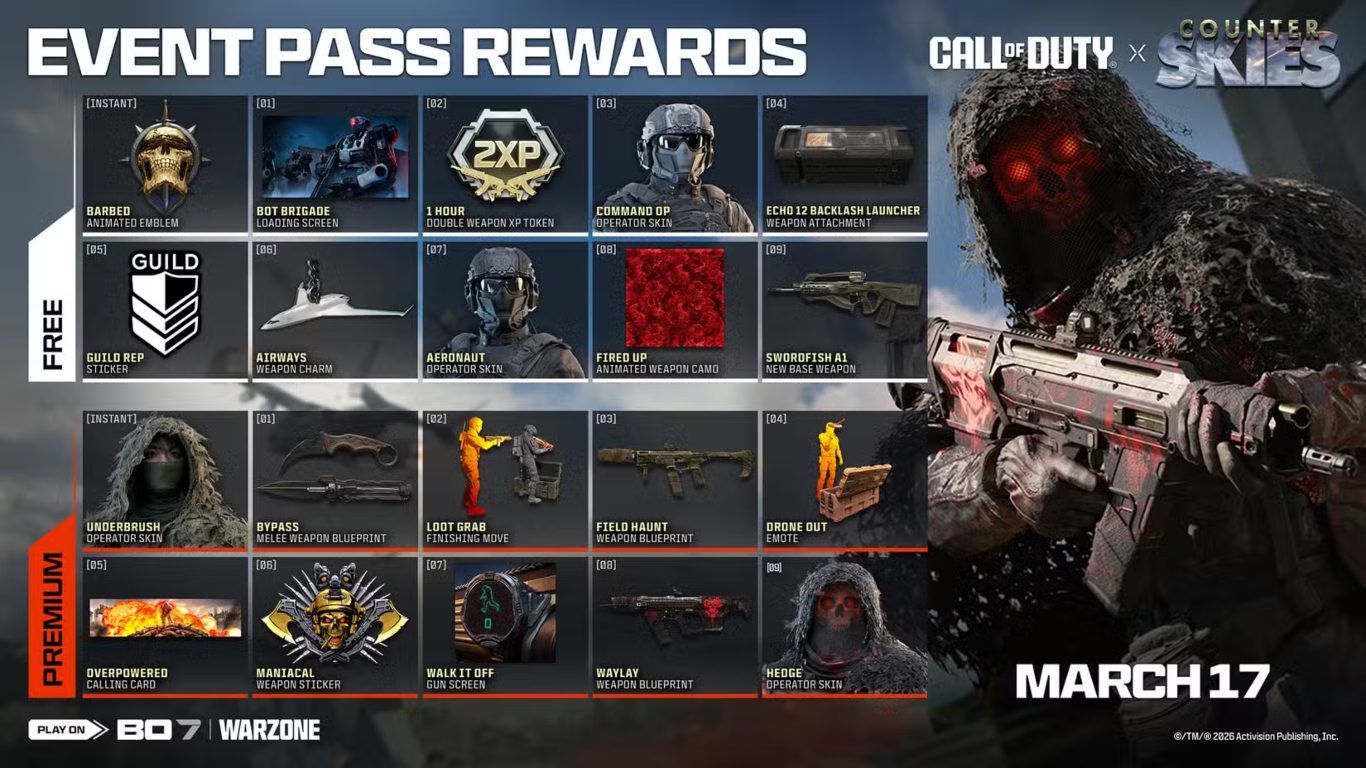 كما يقدم التحديث فعالية Counter Skies Event Pass وهي فعالية تعتمد على نظام المسارات حيث تتضمن مسارا مجانيا ومسارا مميزا يمكن فتحه مقابل 1100 COD Points ويتيح هذا الحدث للاعبين كسب نقاط الخبرة أثناء اللعب لفتح مستويات جديدة من المكافآت داخل المسار ومن بين أبرز الجوائز التي يمكن الحصول عليها في هذا الحدث سلاح Swordfish A1 إضافة إلى تعديل Echo 12 Backlash Launcher Attachment إلى جانب أنماط تلوين مجانية وشخصيات Operators وعناصر تجميلية أخرى تضيف مزيدا من التنوع إلى تجربة اللعب.